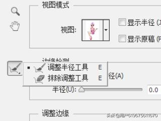 4、选中要扣除的部分之后,点击调整边缘,点选后出现下列对话框,在对话框中选择,调整或者抹除,这里用的是调整,如果多选,则用抹除除去。