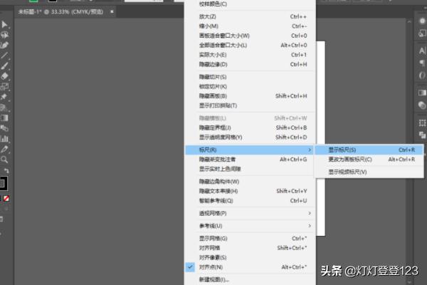 3 当我们不需要网格显示的时候也可以直接按快捷键 ctrl+” 将其隐藏,或者点击右边网格图标,或者在视图菜单中选择隐藏。关于参考线,我们首先需要调出标尺,可以再视图菜单下选择选择显示标尺即可,或者直接按 CTRL +R 也可以调出标尺